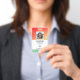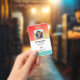 Crachá de identificação de funcionário de empresa com modelos criados para você. O fundo é um moderno abstrato em um gradiente de cor laranja, amarelo e verde.