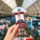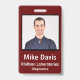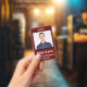 Crachá de identificação clássico de funcionário em design tradicional. Fundo burgundy. Todos os elementos são mutáveis ou removíveis. Elementos incluem: foto do funcionário, nome do funcionário, nome da empresa, departamento do funcionário. O verso do design tem código de barras de segurança. Espaço no topo para cordão.