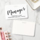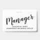 Um simples crachá de identificação de gerente moderno e elegante com um título de tipografia cursiva e seu nome e nome da empresa ou região. Simples, moderno, elegante. Para funcionários de gestão para reuniões, eventos e convenções.