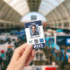 Crachá de identificação vertical de imprensa com detalhes em azul-marinho que você pode personalizar com três logotipos e uma foto. Crachá de identificação de imprensa em branco e azul-marinho com espaço para três logotipos.