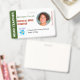 Uma moldura de foto circular dá um toque de classe a este crachá de identificação fotográfico. Faça o upload do seu próprio logotipo e detalhes e adicione mais informações no verso. Veja rapidamente o cargo e as permissões do usuário. Altere as cores do retângulo e da moldura da foto para combinar com o seu local. Adequado para muitos cargos, desde professores, voluntários, funcionários médicos, arrecadadores de fundos ou segurança, etc.
