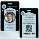 Crachá de identificação com sua foto personalizada e logotipo em um design preto e azul fosco. No verso, você pode adicionar um código de barras ou QR code personalizado e textos adicionais (ou excluir os modelos). Ótimo para criar uma presença atraente.