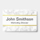 Este crachá de nome de mármore branco tem texto preto e uma linha dourada falsa acima e abaixo do texto. Personalize-o com seu texto, como nome e cargo.