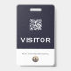 Mantenha seus visitantes e convidados facilmente identificados com este crachá personalizável de visitantes com o logotipo da empresa. O design azul e branco apresenta um logotipo e texto personalizáveis que lê "Visitor" em uma fonte simples. Um código QR facilita o acesso de convidados a informações importantes sobre seu recurso ou evento. O texto na parte inferior lembra aos visitantes que, por favor, devolvam o crachá antes de saírem. Este crachá é perfeito para empresas, hospitais, escolas, museus, atrações e muito mais.