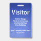 Crachá de identificação vertical de visitante em design gradiente de couro azul. Todos os elementos são mutáveis ou removíveis. Os elementos incluem: Visitante (pode dizer "convidado" ou "acesso" ou qualquer palavra), a frase "Crachá de Visitante Deve Ser Devolvido Antes de Sair do Prédio", nome da empresa, departamento da empresa, código de barras de segurança é na parte de trás e pode ser alterado ou removido. Fenda na parte superior para cordão, mas você pode escolher outra opção, como um clipe de metal ou uma pulseira retrátil.
