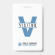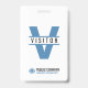 Um crachá de identificação de visitante moderno para a sua empresa, pequena empresa, escola ou hospital. O design simples, mas elegante, mostra a letra maiúscula V com a palavra Visitante. Inclui o nome e logotipo da empresa, bem como uma tag line ou slogan da empresa. Este crachá de identificação de visitante moderno pode ser facilmente ajustado para funcionar como um crachá de identificação para voluntários.