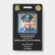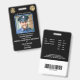 A crachá de identificação personalizável do departamento de polícia apresenta um emblema da polícia no topo que pode ser personalizado para o seu departamento, bem como um local para o logotipo do estado. Personalize com a foto do oficial à esquerda. Ao lado da foto, o nome do oficial, número da crachá, patente e departamento são exibidos. Adicione sua própria código de barras no verso do cartão, juntamente com as datas de emissão e expiração, e descrição do oficial, capitão, chefe ou funcionário do escritório.