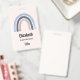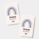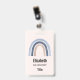 Crachá com um arco-íris fofo e caprichoso. Aquarelas azuis e pêssego.
