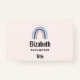 Nome de etiqueta com um arco-íris giro e caprichoso. Aquarelas azuis e de pêssego.