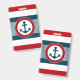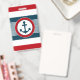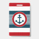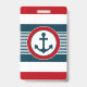 Design náutico com decoração em forma redonda com âncora sobre fundo listrado a azul, vermelho e branco