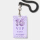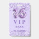 Um crachá VIP moderno, na moda e glamouroso para uma festa de aniversário Doce 16. Um fundo violeta com violeta, confete colorido de lavanda. Com o texto: VIP. Personalizar e adicionar nome