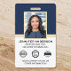 Faça uma impressão profissional com este design de crachá de identificação clássico. Personalize-o facilmente com sua foto de ID, nome, cargo, nome da empresa e código QR. O espaço é fornecido para o seu logotipo e dois símbolos de acreditação. Todo o texto pode ser personalizado para atender às necessidades de sua empresa. Cores impressas: azul marinho muito escuro, branco e ouro.