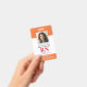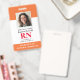 Crachá moderno de enfermeira registrada RN com foto. Design com fundo laranja médico e branco, foto única, nome do hospital, profissão e nome. Personalize com seu código de barras e detalhes de contato. Crachás de identificação modernos tornam simples para clientes e clientes identificarem funcionários. Para editar este modelo, clique em personalizar ainda mais.