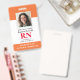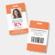 Crachá de Enfermeiro Registrado com ID de Fotografia Moderna RN. Design com antecedentes médicos em laranja e branco, fotografia do solteiro, nome do hospital, profissão e nome. Personalize com seu código de bar e detalhes de contato. Os crachás de ID modernos simplificam a identificação de funcionários por parte dos clientes e clientes. Para editar este modelo, clique em personalizar mais.
