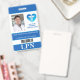 Enfermeiro Prático Licenciado (ou outro, pois você pode alterar as iniciais e a descrição usando as caixas de texto fornecidas) crachá vertical de ID médico com código de barras. Mesmo design sem código de barras também disponível. Design em azul e branco com detalhes em aqua. Siglas LPN em texto branco sobre a seção azul inferior. Área para foto ID com capacidade de adicionar imagens em retrato ou paisagem. Coração azul e aqua com logotipo médico heráldico, que pode ser mantido como está ou alterado para adicionar o logotipo da sua empresa, alterando facilmente a imagem no modelo. Área para nome completo, cargo, hospital ou nome da empresa. Verso em azul com informações caso o crachá seja perdido. Para toda a equipe médica nas linhas, OBRIGADO POR SEU SERVIÇO INCRÍVEL!