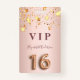 Um moderno, na moda e glamouroso crachá para a doce 16ª festa de aniversário de uma menina. Um rosa de ouro falso e fundo metálico rosa com estrelas douradas falso. O nome é escrito com um moderno e escuro, rosa dourado, escrito com letra de estilo manuscrito. Com o texto: VIP Número 16 é escrito com uma fonte de estilo de balão, script. Voltar: data da festa e endereço do local.