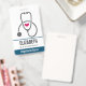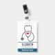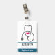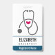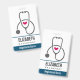 Crachá de nome personalizado com uma ilustração de uma silhueta de estetoscópio cinza com um coração vermelho fofo dentro de uma moldura branca.