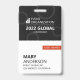 Um crachá moderno para eventos de conferências de negócios. O design mostra o nome da organização que executa o evento e o nome do evento na metade superior. A metade inferior do crachá exibe o nome, a função comercial e de evento da pessoa que está participando do evento. Este crachá de eventos comerciais é ideal para seminários, fóruns anuais, reuniões globais, conferências ou shows de comércio.