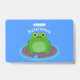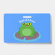 Este sapo verde giro e feliz sentado em uma almofada de lírio roxa é brilhante e adorável. Muita diversão anfíbia desenhada no estilo de animação feliz.