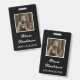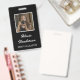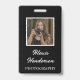 Certifique-se de que as pessoas saibam quem você é quando estiver na sua cabine, andando ao redor de eventos e shows comerciais com este nome de etiqueta de fotos preto e branco que apresenta roteiro branco e tipografia moderna e foto pessoal com borda branca em um fundo preto em ambos os lados.