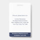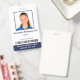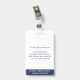 Mantenha seu hospital ou consultório médico seguro com crachás personalizados de identificação com a foto do funcionário, nome, cargo, número de identificação e código de barras, bem como o nome da empresa. Você também pode incluir um departamento, se desejar. Perfeito para enfermeiros ou outros funcionários. No verso, você pode adicionar mais informações, como para onde devolver o crachá se ele se perder. Personalize-o com uma foto, código de barras e texto personalizado na barra lateral. A foto quadrada tem uma borda azul fina em um fundo branco. O texto é azul escuro, exceto pelo nome do hospital na parte inferior, que é branco em uma faixa azul marinho.