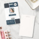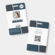 Cartão de identificação profissional com foto, logotipo, código de barras e modelos de código qr incluídos. Este estilo de design moderno tem tons de azul-esverdeado escuro e preto com base branca. Design semelhante no verso, com endereço comercial, endereço do site e um código qr do site.