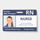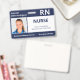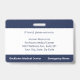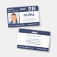Mantenha seu hospital ou consultório médico seguro com crachás de identificação personalizados horizontais com a foto do funcionário, nome, abreviação do cargo profissional, título do cargo, número de identificação e nome da empresa. Você também pode incluir um departamento, se desejar. Perfeito para enfermeiros ou outros funcionários. No verso, você pode adicionar mais informações, como onde devolver o crachá se ele se perder. Personalize-o com uma foto e texto personalizado na barra lateral. A foto quadrada à esquerda tem uma borda branca fina cercada por listras azuis-marinho na parte superior e inferior e linhas finas azuis-marinho ao lado. Um bloco branco no centro à direita destaca o título do cargo, número de identificação e data de validade em texto azul-marinho. O nome do funcionário, sigla do cargo e texto do hospital ou empresa são brancos sobre azul-marinho.