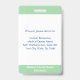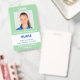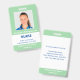 Mantenha seu hospital ou consultório médico seguro com crachás de identificação personalizados com a foto, nome, cargo e número de identificação do funcionário, bem como o nome da empresa. Você também pode incluir um departamento, se desejar. Perfeito para enfermeiros ou outros funcionários. No verso, você pode adicionar mais informações, como onde devolver o crachá se ele se perder. Personalize-o com uma foto e texto personalizado na barra lateral. A foto quadrada tem uma borda branca fina em um fundo verde claro. Uma faixa branca perto da parte inferior destaca o cargo, número de identificação e data de validade em texto azul. O nome do funcionário e o texto do hospital ou empresa são brancos em verde claro.