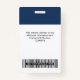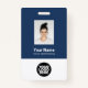 Personalize facilmente este Crachá de Nome de Funcionário Personalizado com Foto, Código de Bar de Digitalização e logotipo comercial. Um simples design de negócios em cores azul e branco marinho totalmente personalizável em tamanhos frontais e traseiros, fontes básicas e modernas sans-serif e um visual profissional e claro. Disponível com jardim, clipe de metal ou com retratável. Sem ordem mínima.