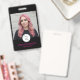 Impressione seus clientes com este distintivo de foto com um design de tipografia elegante em preto ousado e rosa choque junto com o seu logotipo, além de uma foto e o título dos seus funcionários. No verso, personalize com o nome da sua empresa, seu logotipo e todas as suas informações de contato.