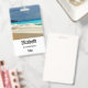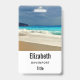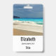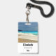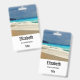 Crachá personalizado com uma bela fotografia que apresenta um mar azul-turquesa e uma praia arenosa com ondas de surf de espuma.