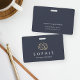 Perfeito para o seu spa, saúde holística e bem-estar, estúdio de yoga ou empresa de terapia de massagem, o design apresenta um rico fundo azul-marinho adornado com um logotipo de flor de lótus em folha de ouro falso. Personalize com o nome do seu funcionário e cargo ou função em letras brancas clássicas. Uma silhueta de uma pessoa meditando é sutilmente trabalhada neste design moderno e elegante, perfeito para a marca da sua empresa relacionada ao bem-estar. Adicione o endereço da sua empresa ou informações adicionais no verso.