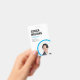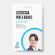 Um cartão de identidade moderno com uma grande foto redonda de funcionário no canto inferior direito. O nome do funcionário é exibido em uma fonte grande em negrito. Ideal para qualquer empresa ou empresa identificar o funcionarios. Esta versão do crachá é definida em um esquema de cor branco e azul.