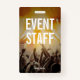 Um crachá moderno e universal para os eventos e funcionarios. O design mostra uma foto de fundo do evento e inclui o texto "FUNCIONARIOS do EVENTO", bem como o nome e a data do evento. Este crachá de funcionarios de evento vertical é ideal para eventos que exigem a identificação do funcionarios. O crachá do funcionarios de eventos pode ser facilmente modificado para funcionar em diferentes pessoas que participam do evento, como VIPs ou banda.