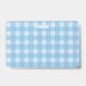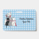 Este nome ou crachá de identificação é xadrez azul e branca com três gatinhos giros vestindo arcos cor-de-rosa sentados com a mãe branca sorridente. Personalize seu nome e informações com os modelos.