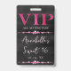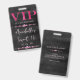 Este crachá de passe de acesso total VIP glamoroso apresenta um design cintilante e feminino em um fundo preto. O título VIP é impresso em uma fonte estilo folha de rosa, seguido pelo título do evento. Cordões de diamantes rosa separam o texto. O local e a hora da festa ou evento são impressos no verso. É perfeito para uma festa de aniversário, sweet 16, chá de noiva ou outra celebração elegante.