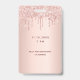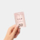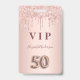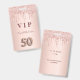 Um crachá moderno, na moda e glamouroso para uma festa de aniversário 50ª. Um fundo metálico rosa dourado falso com um brilho elegante rosa dourado, pintura gota-a-gota. O nome é escrito com um moderno e escuro, rosa dourado, escrito com letra de estilo manuscrito. Com o texto: VIP Number 50 é escrito com uma fonte de estilo de balão, script. Voltar: data da festa e endereço do local.