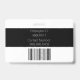 A parte traseira do crachá apresenta informações adicionais sobre funcionários ou empresas impressas sobre um plano de fundo preto, com um código de barras de exemplo colocado na parte inferior. Você pode substituir o código de digitalização por sua própria imagem ou outra, como um logotipo personalizado.