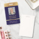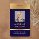 Crachá de ID de Foto Moderno em azul e ouro marinho com espaço para uma foto de perfil personalizada, título do cargo, detalhes de contato, serviços e código de barras. Este elegante crachá de nome de funcionário apresenta fundo azul escuro e efeitos dourados falsos com texto totalmente editável e uma foto.