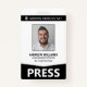 Um crachá de identificação profissional para jornalistas e funcionários da empresa de notícias. O modelo de crachá de ID de passe de imprensa inclui uma foto de ID do funcionário, o nome do funcionário e o título do cargo, bem como um número de ID do crachá. O nome do grupo definido como PRESS é exibido proeminentemente na parte inferior com uma seta como design apontando-a para fora. O verso do crachá de ID de passe de imprensa jornalista apresenta um código de barras opcional e pode ser usado para adicionar mais informações sobre o funcionário e sua empresa.