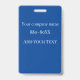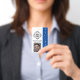 Este crachá de identificação para uma guarda de segurança ou funcionário apresenta um fundo branco com um logotipo de exemplo no centro. Você pode personalizar o crachá de ID para exibir o logotipo de sua própria empresa, empresa ou organização ou sua própria imagem personalizada. Há uma área abaixo do logotipo para impressão um nome de funcionário ou outro texto. A palavra "SEGURANÇA" é impressa no lado direito sobre uma faixa azul. Uma foto de exemplo é impressa na parte inferior que você pode substituir para fazer sua própria identificação fotográfica. A parte traseira do crachá tem um fundo azul com texto branco, no qual você pode incluir o número de telefone da sua empresa ou outras informações.