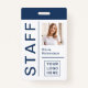 Este crachá de identificação da empresa moderno e atraente para o seu funcionarios é muito mais atual e na moda do que qualquer crachá de ID antigo! O design azul e branco do marinho apresenta uma tipografia grande e ousada, com um arranjo minimalista de linhas e espaço para a foto de seu funcionário, bem como um ponto para o logotipo de sua empresa ou evento. A parte traseira do crachá tem espaço para informações adicionais, se necessário. Este crachá é profissional o suficiente para a sua conferência corporativa ou profissional ou escritório padrão, mas atualizado o suficiente para o seu entretenimento ou evento musical ou funcionarios e segurança de concertos.