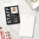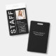 Este crachá de identificação da empresa moderno e atraente para o seu funcionarios é muito mais atual e na moda do que qualquer crachá de identificação antigo! O design preto apresenta uma tipografia branca grande e ousada, com um arranjo minimalista de linhas e espaço para a foto de seu funcionário, assim como um ponto para o logotipo de sua empresa ou evento. A parte traseira do crachá tem espaço para informações adicionais, se necessário. Este crachá é profissional o suficiente para sua conferência corporativa ou profissional ou escritório padrão, ainda atualizado o suficiente para seu entretenimento ou evento musical ou funcionarios e segurança de concertos, ou até mesmo seu funcionarios de loja de varejo ou de lojas!