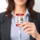 Um fundo vermelho e fontes em letras maiúsculas sólidas adicionam importância e facilidade de legibilidade a este crachá de identificação de animal de serviço. Personalize com o nome do animal, nome do tratador e endereço, além do número de registro e código UPC. O tipo de letra e as cores da fonte podem ser modificados conforme desejado.