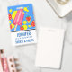 Crachá com tema de verão. Projetado com picolé rosa e alguns morangos vermelhos caindo em volta do picolé junto com alguns respingos de tinta amarela. Fundo azul.