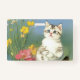 Crachá com uma ilustração adorável de gatinho. Um gatinho branco com listras pretas e olhos grandes se senta sobre suas pernas traseiras em um jardim de flores cor-de-rosa, amarelas e brancas. Um presente maravilhoso para amantes de gatos e entusiastas de arte vitorianos!