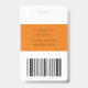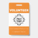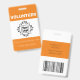 Este crachá de identificação personalizado para funcionários ou voluntários apresenta um logotipo ou imagem de amostra no centro. O título "VOLUNTÁRIO" é impresso acima dele em fonte branca em negrito sobre um fundo laranja. Você pode incluir o nome da sua empresa, negócio ou organização ou texto adicional abaixo do logotipo, bem como o nome do funcionário. A parte de trás do crachá apresenta informações adicionais do funcionário ou da empresa impressas sobre um fundo laranja, com um código de barras de amostra colocado na parte inferior. Você pode substituir o código de barras por um próprio ou outra imagem.