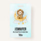 Um nome de etiqueta com uma ilustração de aquarela fofa. Um adorável leão vestindo uma coroa pescando estrelas sentadas em uma lua crescente descansando em uma nuvem fofinha. Ilustração de fantasia mágica. Fundo de aquarela azul claro.