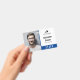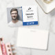 Crachá de ID do funcionário com um design minimalista limpo em azul, preto e branco. Adicione uma foto do funcionário junto com o nome e a profissão. Personalize ainda mais com o logotipo da sua empresa.
