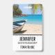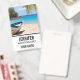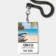 Nome crachá com uma cena de praia tropical idílica. Água clara de cristal azul turquesa e uma praia arenosa castanha macia. Algumas folhas de palma penduradas de cima. Um velho barco a remo de madeira fica sentado na praia. Uma paisagem serena e pacífica.